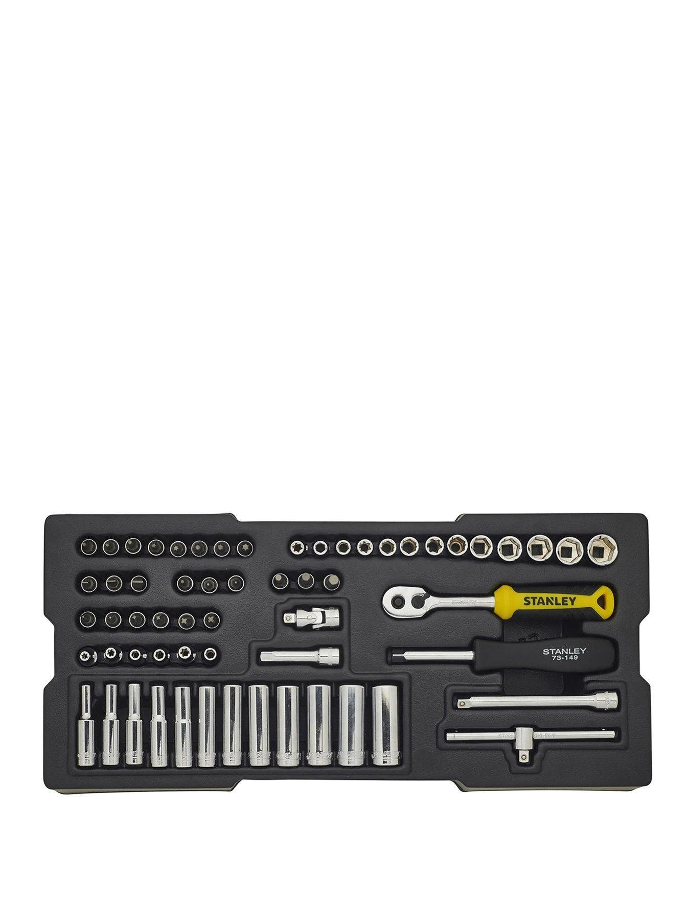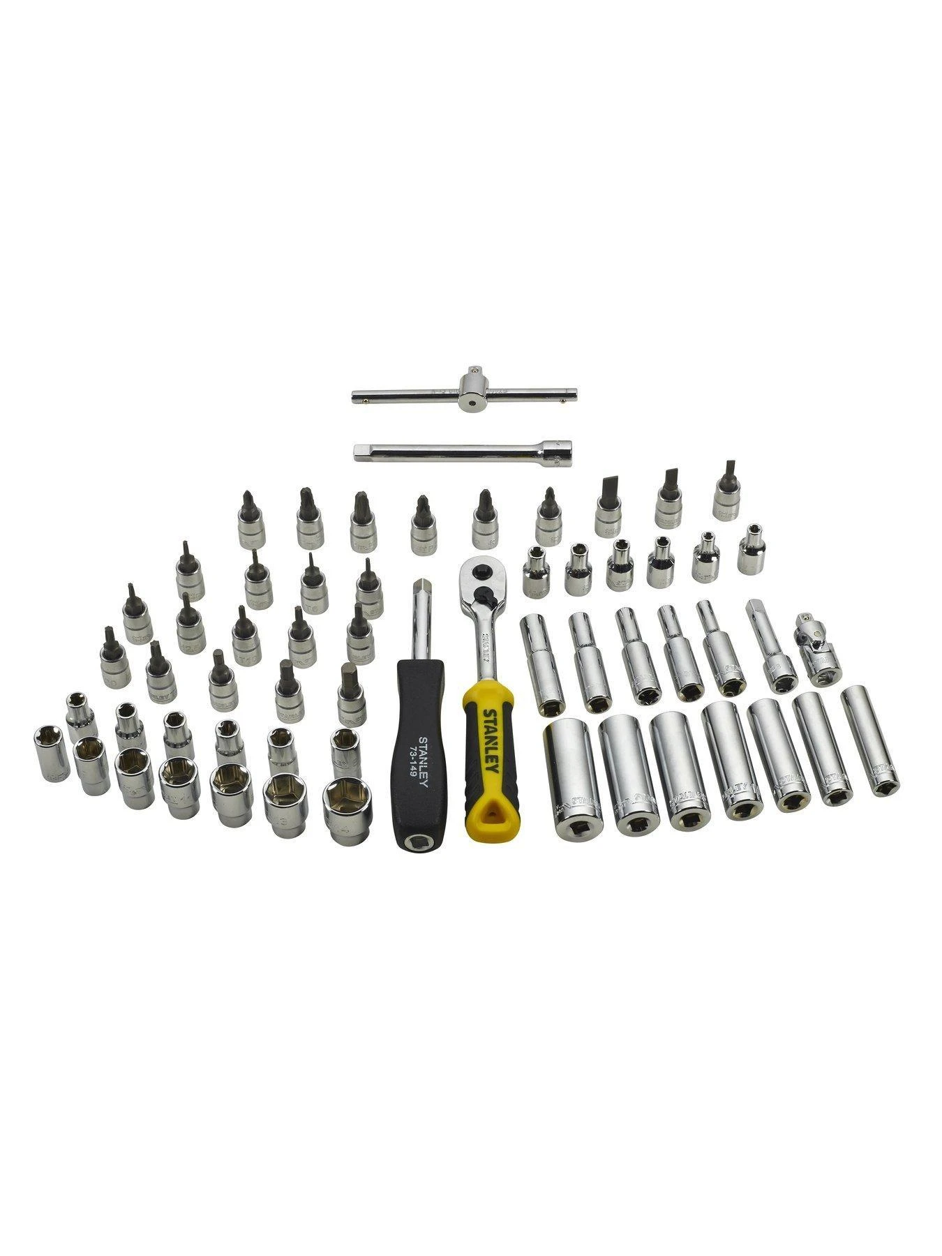 The STANLEY 60PC 1/4″ Metric Socket Set includes a 1/4″ ratchet which features quick release, lever reverse and rotation direction display functions. The ratchets ergonomic bi-material handle grip delivers added comfort and helps to reduce fatigue. It has been made from chrome vanadium steel and is chemical resistant for added durability and longer tool life. The Hex sockets feature a Maxi Drive wall profile for improved grip on fastener. The set is finished off in fully polished chrome for added durability and rust resistance. The set includes ¼2 Socket, 13 6Pt standard sockets: 4, 4.5, 5, 5.5, 6, 7, 8, 9, 10, 11, 12, 13, 14mm, 13 6Pt deep sockets: 4, 5, 5.5, 6, 7, 8, 9, 10, 11, 12, 13, 14mm, 3 slotted bit sockets: 4, 5.5, 7mm, 3 Pozidriv bit sockets: PZ1, PZ2, PZ3 and 3 Phillips bit sockets: PH1, PH2, PH3.