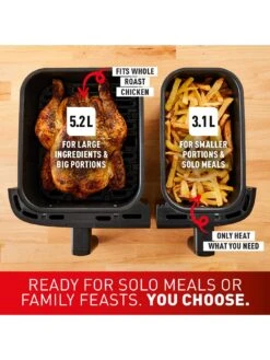 With two different sized drawers (5.2L/3.2L), the Easy Fry Dual air fryer and grill is a single and dual zone air fryer in one. Only heat the small one to save energy or both to cook two foods, two ways, at once – even a whole chicken!