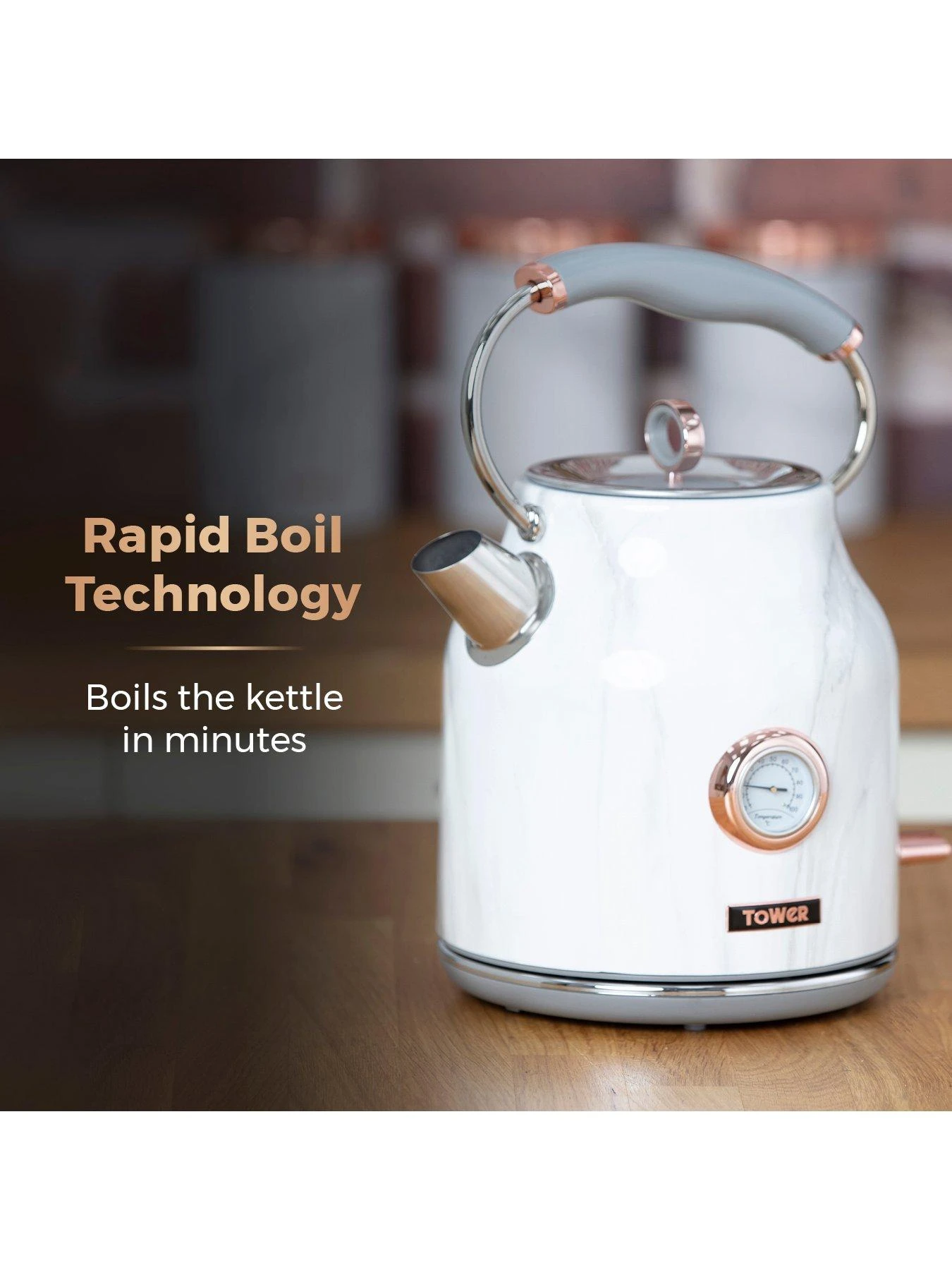 Boil your beverages in reduced time with the 3kW rapid boiling heating element of this Kettle. Designed with our contemporary white marble exterior coating, featuring a unique rose gold temperature dial and boiling switch, for a stylish finish on your worktop.