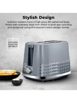 Enhance your kitchen top with the elegant Tower Solitaire 2-slice Toaster. Embossed in a 3D diamond pattern decoration, the Solitaire collection elevates modern design in the home. The 2 slots feature enough space to fit bread and snacks of varying sizes, including home-cut bread.