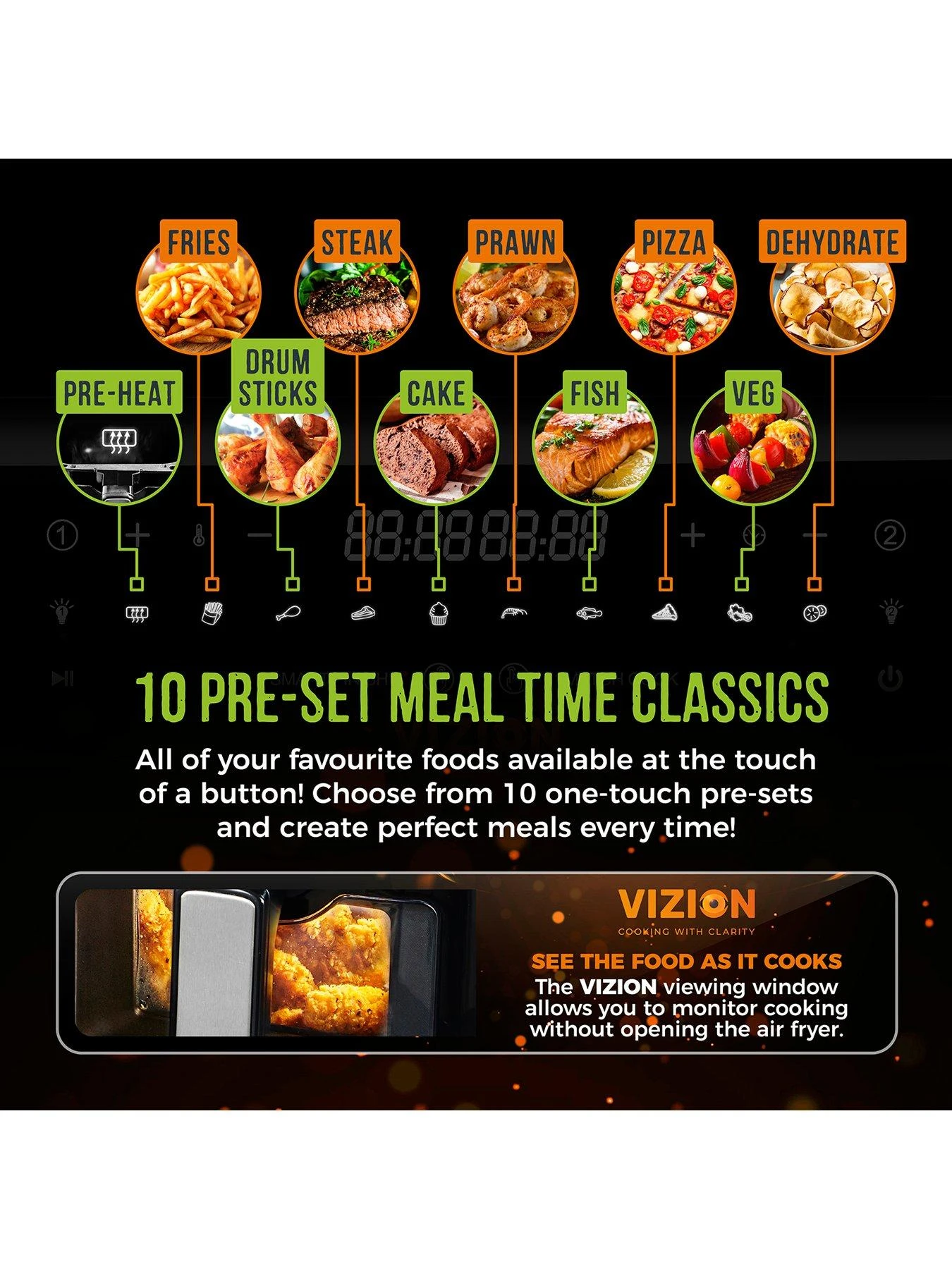 Choose from 10 one-touch pre-sets to take the guess work out of cooking. Air fry crispy, delicious heathy foods without the need to deep fry. Roast succulent chicken, pork beef or lamb. Become a star baker creating cakes, tarts or pies with the bake function or grill juicy steaks with the crisper grill plate. Vizion viewing windows in each drawer allow you to keep an eye on the progress.