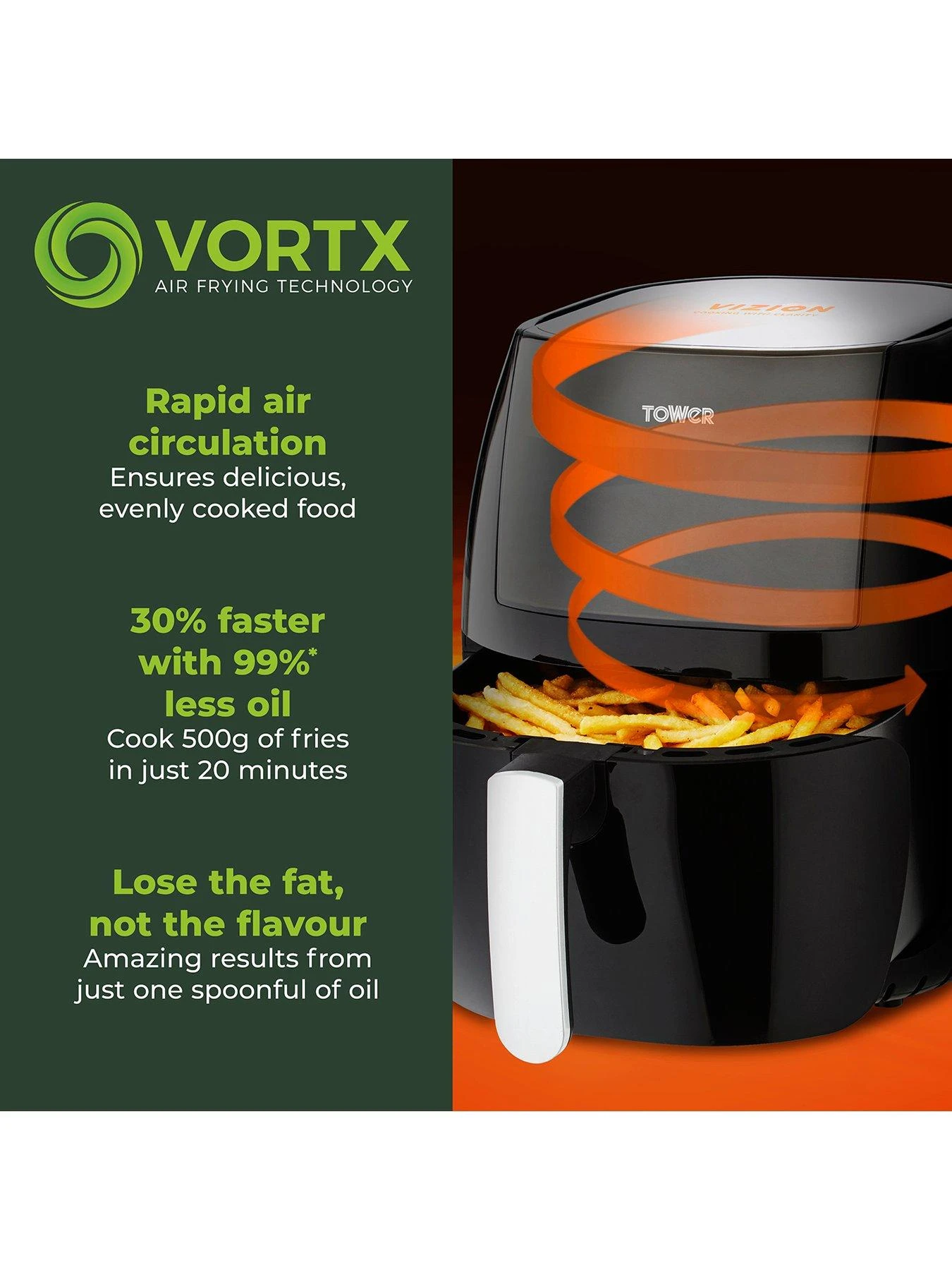 - VORTX TECHNOLOGY: Rapid air circulation cooks 30% faster with 99% less oil