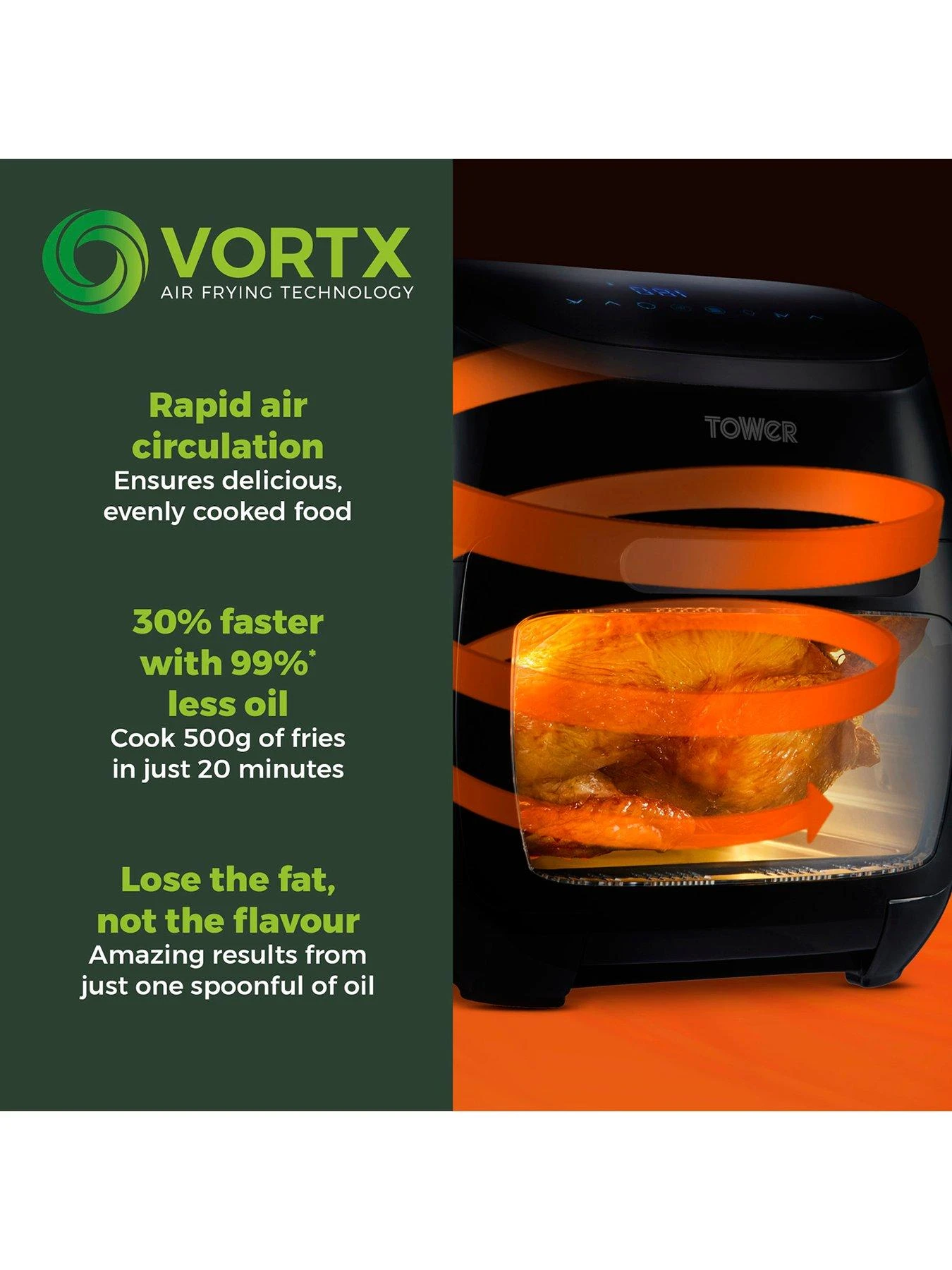 - VORTX TECHNOLOGY: Rapid air circulation cooks food 30% faster with 99% less oil